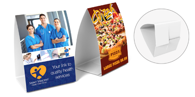Table Tents are printed on one side only. They have (3) die scores and (2) die slits to create an easy interlocking system. Even-though the Table Tents are shipped flat they are quick and easy to assemble to form a 2-sided tent shaped marketing piece.